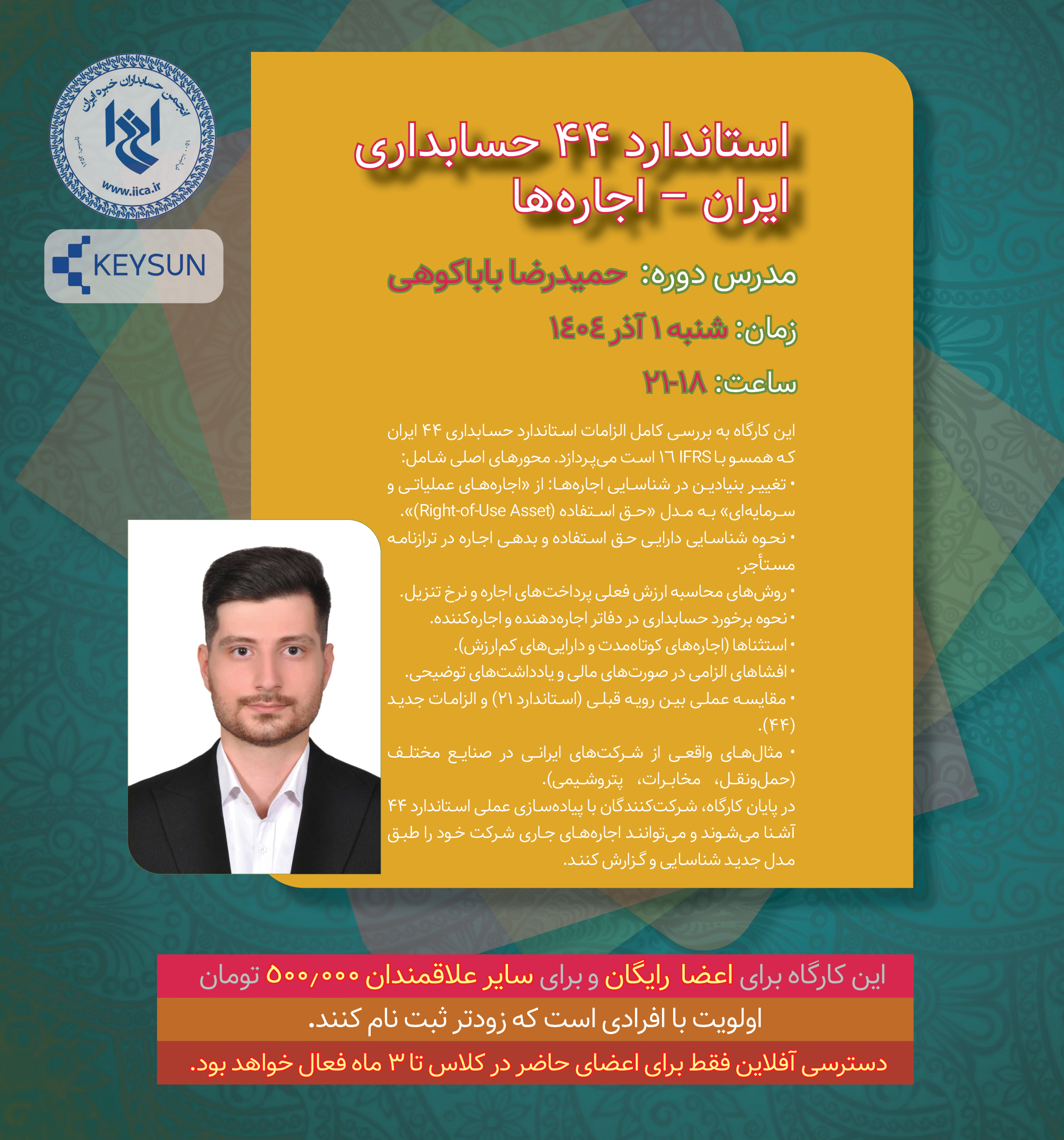 این کارگاه به بررسی کامل الزامات استاندارد حسابداری ۴۴ ایران که همسو با IFRS 16 است میپردازد. محورهای اصلی شامل: