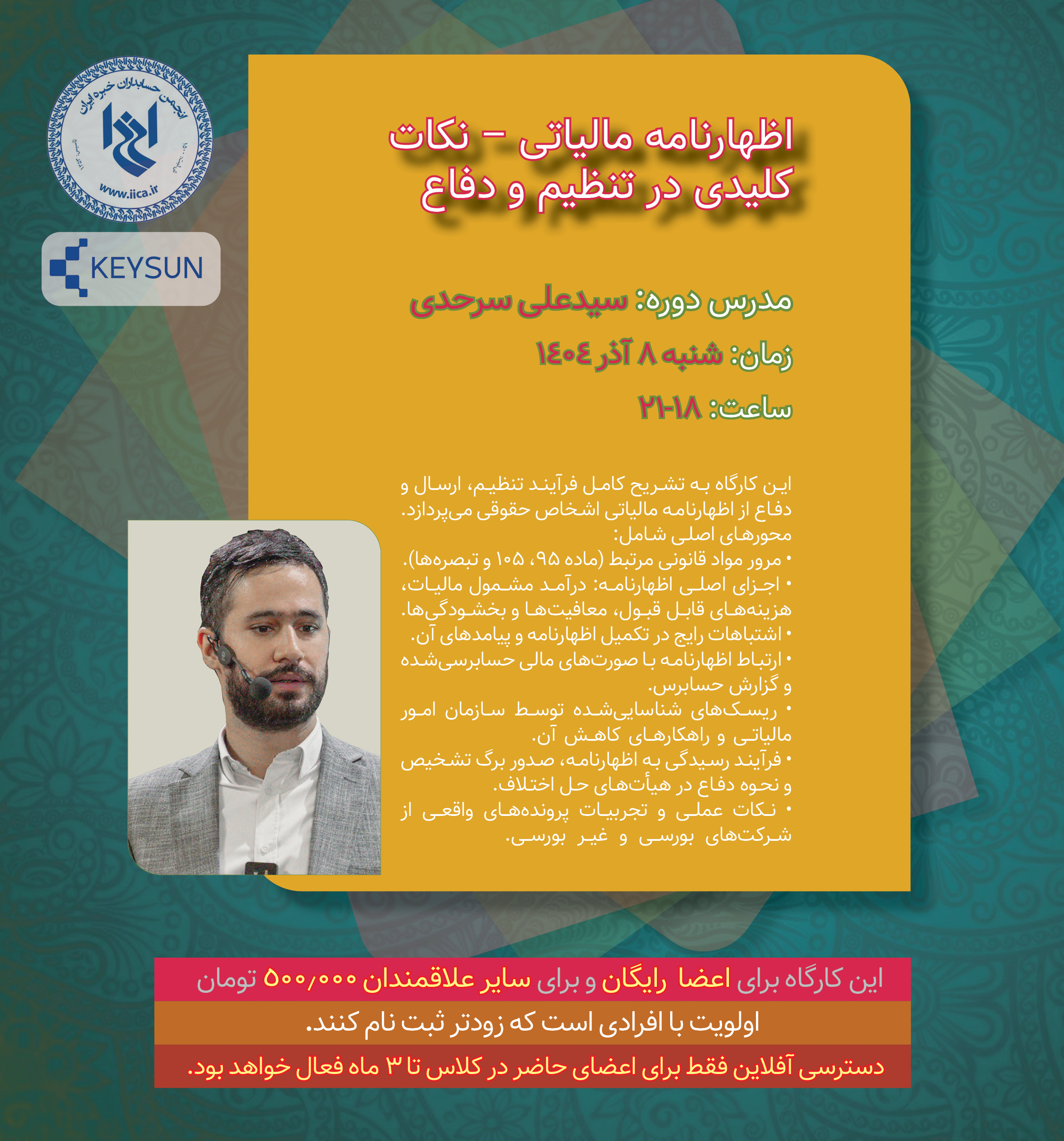این کارگاه به تشریح کامل فرآیند تنظیم، ارسال و دفاع از اظهارنامه مالیاتی اشخاص حقوقی میپردازد. محورهای اصلی شامل: