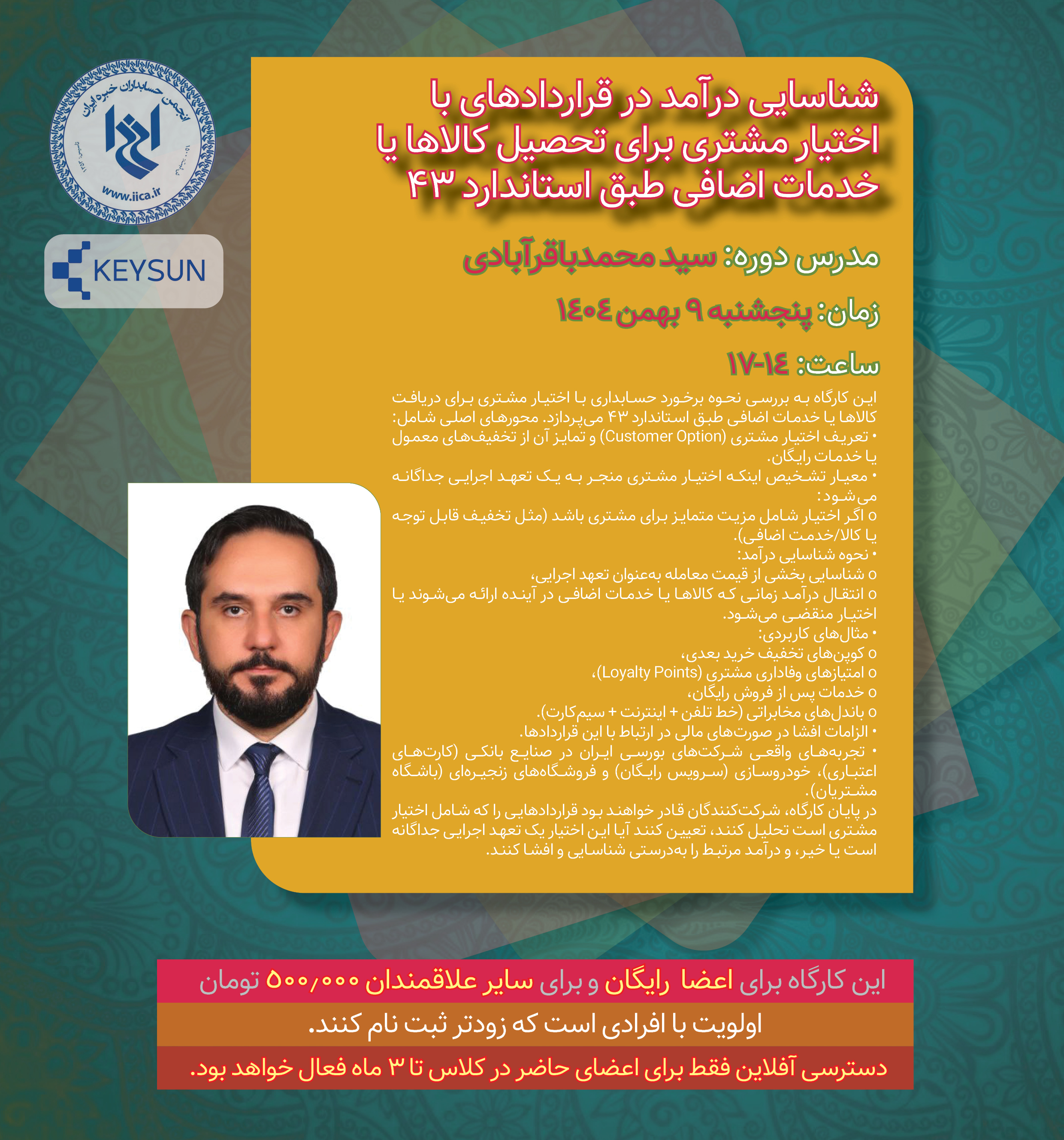 این کارگاه به بررسی نحوه برخورد حسابداری با اختیار مشتری برای دریافت کالاها یا خدمات اضافی طبق استاندارد ۴۳ میپردازد. محورهای اصلی شامل: