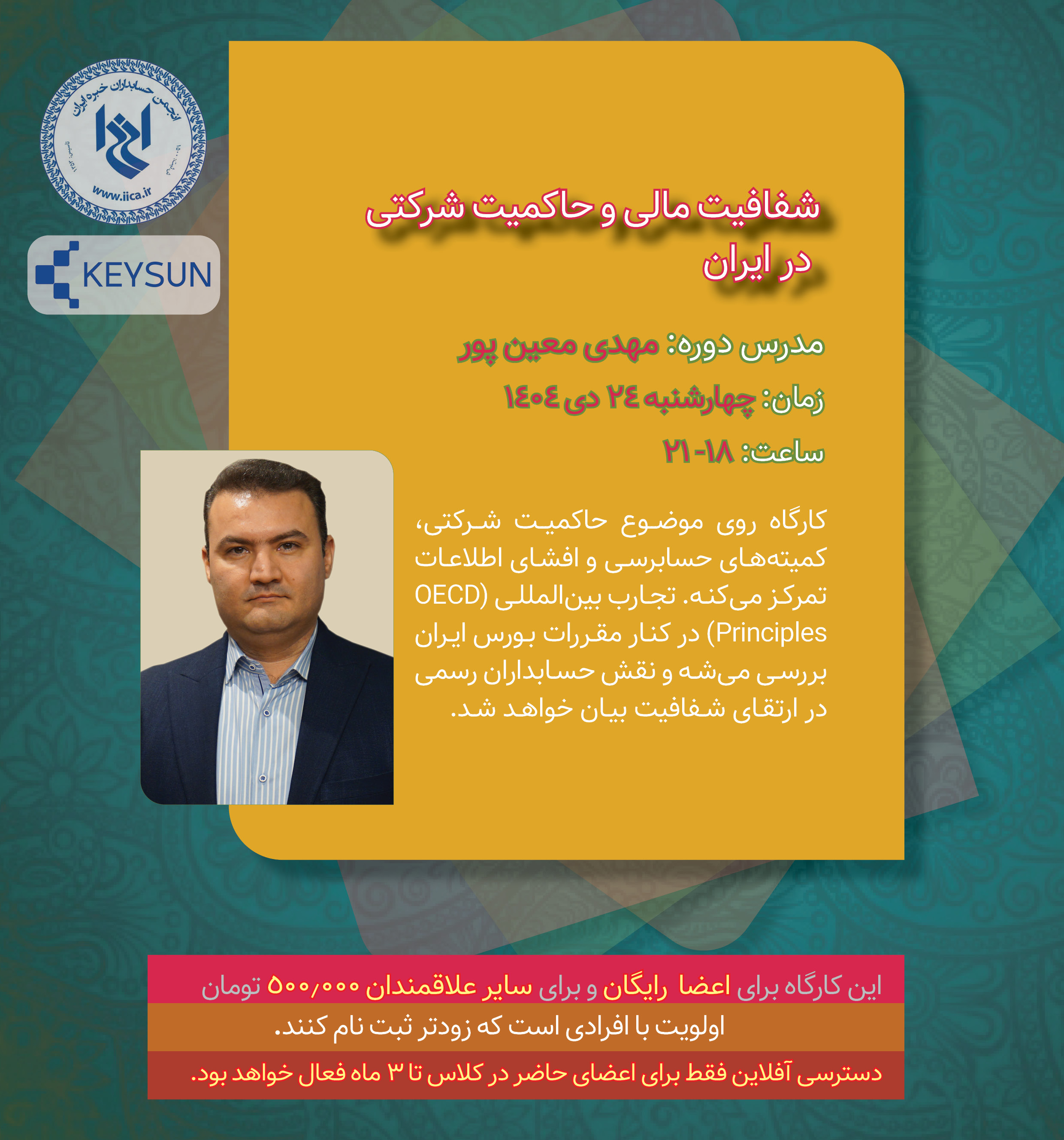 کارگاه روی موضوع حاکمیت شرکتی، کمیتههای حسابرسی و افشای اطلاعات تمرکز میکنه. تجارب بینالمللی (OECD Principles) در کنار مقررات بورس ایران بررسی میشه و نقش حسابداران رسمی در ارتقای شفافیت بیان خواهد شد.