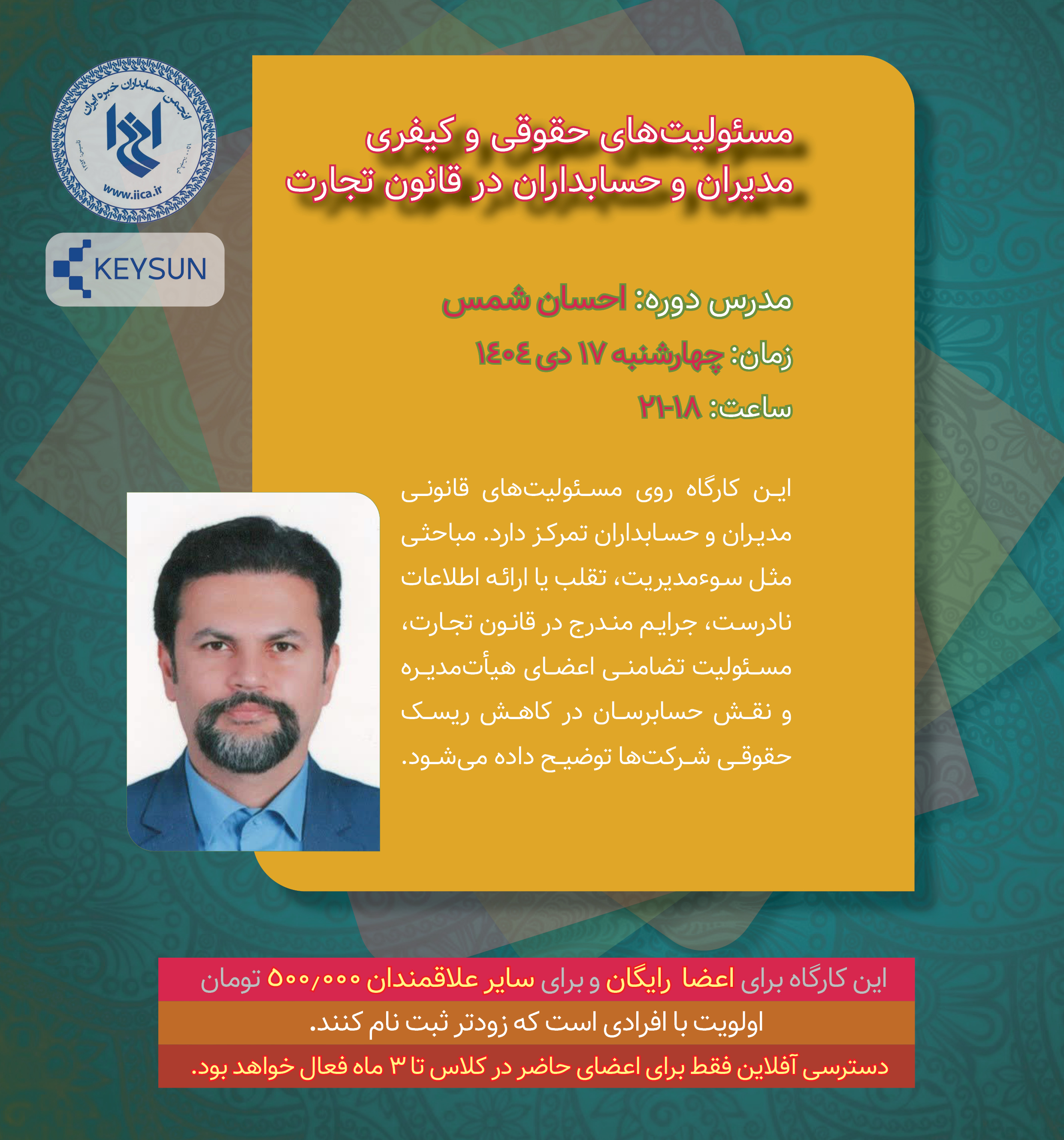 این کارگاه روی مسئولیتهای قانونی مدیران و حسابداران تمرکز دارد. مباحثی مثل سوءمدیریت، تقلب یا ارائه اطلاعات نادرست، جرایم مندرج در قانون تجارت، مسئولیت تضامنی اعضای هیأتمدیره و نقش حسابرسان در کاهش ریسک حقوقی شرکتها توضیح داده میشود.